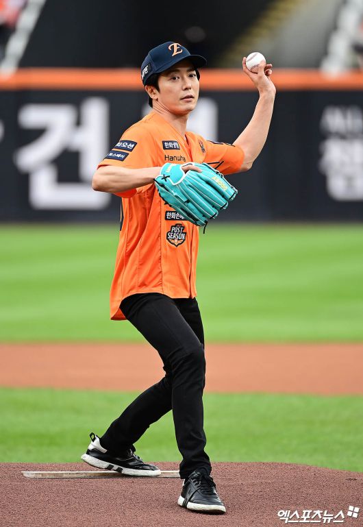 (엑스포츠뉴스 대전, 박지영 기자) 19일 오후 대전한화생명볼파크에서 열린 '2025 신한 SOL Bank KBO 포스트시즌' 삼성 라이온즈와 한화 이글스의 플레이오프 2차전 경기에 앞서 배우 김재욱이 시구를 하고 있다. 박지영 기자 jypark@xportsnews.com