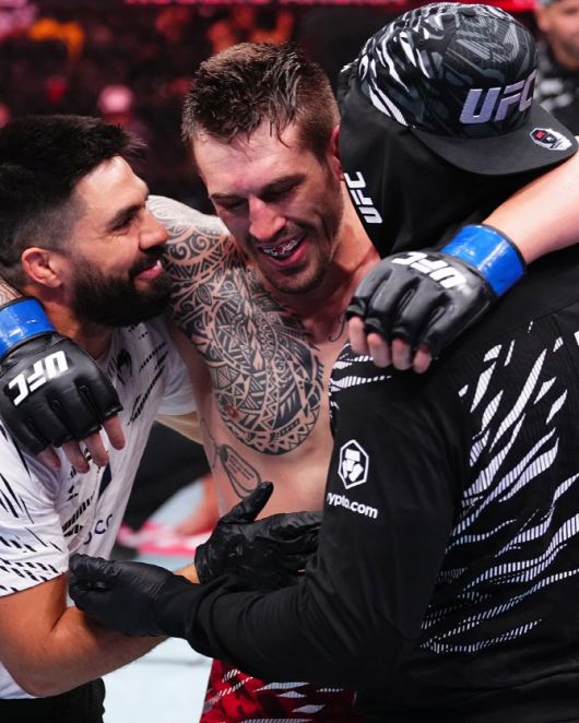 브렌던 앨런이 승리를 거둔 뒤 팀동료들과 함께 기뻐하고 있다. 사진=UFC