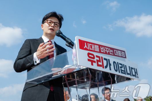 한동훈 국민의힘 전 대표가 10일 오후 서울 여의도 국회 분수대 앞에서 제21대 대통령 선거 출마를 선언한 뒤 취재진 질의에 답하고 있다. 2025.4.10/뉴스1 ⓒ News1 안은나 기자 |