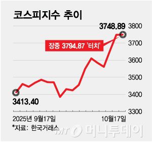 19일 한국거래소에 따르면 코스피 지수는 지난 17일 전주 대비 138.29포인트(3.83%)오른 3748.89에 장을 마감했다. 이날 코스피 지수는 종가 기준 최고치를 경신했으며 장 중 한때 3794.87까지 치솟으며 3800 돌파를 시도했다.