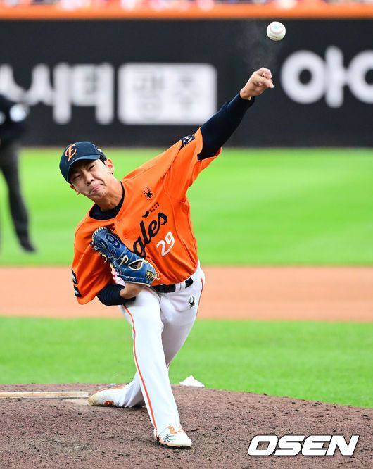 [OSEN=대전, 지형준 기자] 19일 오후 대전 한화생명볼파크에서 2025 신한 SOL Bank KBO리그 포스트시즌 플레이오프 2차전 한화 이글스와 삼성 라이온즈의 경기가 열렸다. 한화는 라이언 와이스, 삼성은 최원태를 선발 투수로 내세웠다. 6회초 한화 황준서가 역투하고 있다. 2025.10.19 /jpnews@osen.co.kr