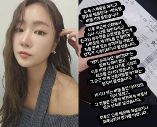 소유는 지난 19일 자신의 인스타그램을 통해 델타항공 탑승권 사진을 찍어 올리며 "뉴욕 스케줄을 마치고 경유로 애틀랜타에서 한국행 비행기에 올랐다"며 "너무 피곤한 상태에서 식사 시간을 확인하려고 한국인 승무원을 요청했을 뿐인데, 사무장은 내 태도를 단정하며 문제있는 승객처럼 대했고 갑자기 시큐리티까지 불렀다"고 썼다.