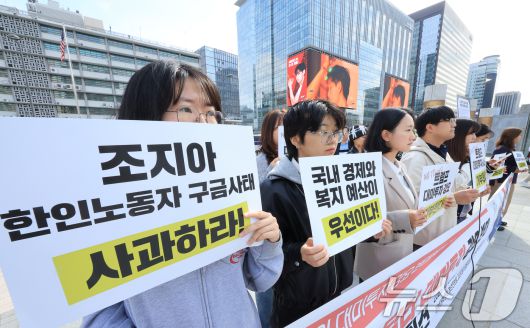 (서울=뉴스1) 이호윤 기자 = 대학생·청년단체(진보대학생넷, 청년진보당 등) 회원들이 20일 서울 종로구 광화문 광장에서 '3500억 달러 대미투자 강요 반대 대학생 기자회견'을 갖고 있다. 2025.10.20/뉴스1
