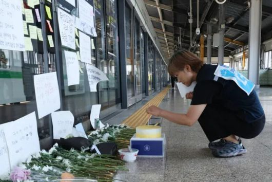 구의역 산재 사망 8주기 다음날인 지난해 5월29일 오전 서울 광진구 구의역 9-4 승강장에서 스크린도어를 혼자 정비하다 열차에 치여 숨진 열아홉살 하청 노동자 김씨의 생일기억식이 열려 조성애 민주노총 공공운수노조 노동안전보건국장이 생일케이크에 초를 꽂고 있다. 신소영 기자 viator@hani.co.kr |