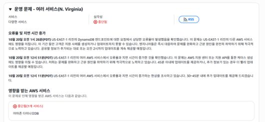 실제로 AWS는 미국-이스트-1 리전에서 오류가 발생했다는 공지를 올렸다. AWS는 공지를 통해 “20일(현지 시간) 오전 1시 26분 미국-이스트-1 리전에서 상당한 오류율이 발생했다”며 “이 기간 동안 고객은 지원 사례를 생성하거나 업데이트하지 못할 수 있다”고 설명했다. AWS는 데이터센터를 묶은 물리적 위치를 통상 ‘리전’이라고 부른다. 미국 이스트 리전은 AWS의 데이터센터 중에서도 가장 핵심적인 곳 중 하나로 꼽힌다.