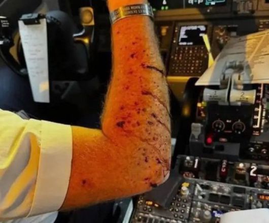 조종석 앞유리를 부수고 날아든 정체 불명의 물체에 팔을 다친 비행기 기장의 모습. 사회관계망서비스(SNS) 캡처 |