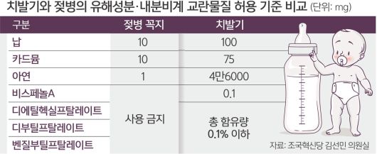 구체적으로 치발기의 납 허용 기준은 100㎎으로 젖병(10㎎)보다 10배나 많다. 카드뮴도 치발기는 75㎎, 젖병은 10㎎으로 7.5배나 많이 허용하고 있다. 아연은 치발기가 4만6000㎎, 젖병이 1㎎으로 허용 기준 차이가 더 극심하다. 납은 뇌 발달을 저해하고, 카드뮴은 뼈에 이상을 일으키거나 간과 신장에 축적되는 중금속 물질이다.
