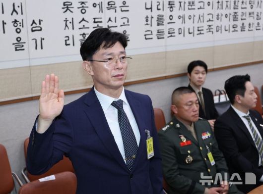[서울=뉴시스] 김금보 기자 = 임성근 전 해병대1사단장이 지난 17일 서울 여의도 국회에서 열린 법제사법위원회의 군사법원에 대한 국정감사에서 선서를 하고 있다. 2025.10.17. kgb@newsis.com |