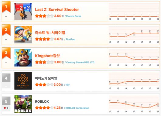 간신히 2위를 버텼던 ‘킹샷’은 결국 3위로 밀려났다. 반면, ‘마비노기 모바일’은 꾸준한 이벤트와 업데이트 효과를 앞세워 한 계단 더 상승, 4위까지 올라왔다. 긴 추석 연휴 동안 가족 단위 플레이로 상승세를 탔던 ‘로블록스’는 다시 소폭 하락하며 5위를 지켰다.