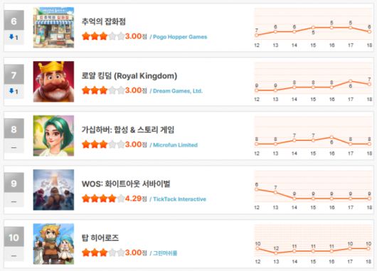 중위권에서는 ‘로얄 킹덤’이 7위로 소폭 반등했고, ‘가십하버: 합성 & 스토리 게임’은 8위로 하락세를 이어갔다. ‘탑 히어로즈’는 끈질긴 업데이트와 유저 복귀 효과로 TOP10의 문턱을 굳건히 지켜내고 있다.