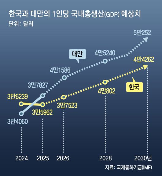 반면 대만은 인공지능(AI)발 고성장에 힘입어 1인당 GDP가 지난해 3만4060달러에서 올해 11.1% 증가한 3만7827달러가 될 것으로 IMF는 분석했다. 세계 순위도 38위에서 35위로 세 계단 뛸 것으로 예상된다. 게다가 내년에는 4만 달러, 5년 뒤인 2030년에는 5만 달러 시대를 열 것으로 예측됐다.