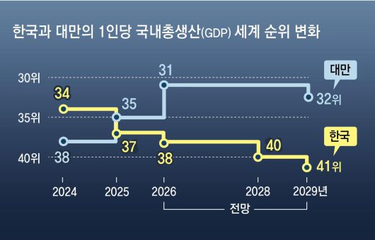 앞서 한국과 대만의 1인당 GDP가 22년 만에 역전될 것이란 전망은 있어 왔지만 IMF가 5년 내 격차가 더욱 커질 것으로 전망한 점은 한국 경제에 뼈아프다는 지적이 나온다. 한국과 대만은 둘 다 반도체 및 정보기술(IT) 산업이 경제의 주축이다. 비슷한 주력 산업을 갖추고 있는데도 성장률 추이가 판이하게 달라진 것은 한국 경제의 구조적 문제를 시사하기 때문이다.