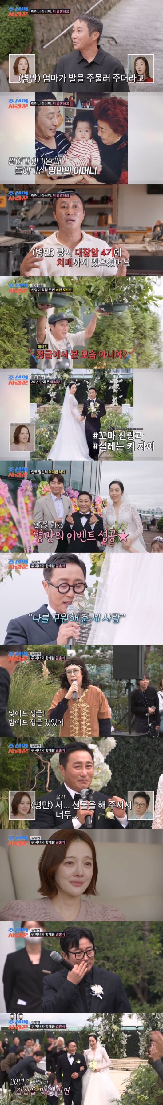 20일 방송된 ‘조선의 사랑꾼’에선 결혼식을 앞둔 김병만이 “꿈에서 엄마가 발을 주물러 주시더라. 그래서 더 생각났다”며 부모님을 봉안한 사찰로 온 가족이 향한 이유를 밝혔다. 마찬가지로 결혼식을 앞두고 김준호와 함께 아버지 산소에 인사를 올렸던 김지민은 “평소 올라갔을 때 눈물이 그렇게 나지 않는데 ‘진작에 짝을 찾아서 보여드릴걸’ 하는, 만감이 교차하면서 눈물이 왈칵 쏟아지더라”면서 공감했다. 이어 공개된 과거 인터뷰에서는 김병만의 아내가 20대 초반이었던 연애 시절, 대장암 4기이자 치매까지 앓고 계셨던 시아버님을 같이 병시중했던 경험담을 털어놨다.