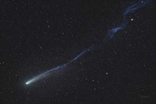 10월18일 체코 세치호수에서 촬영한 C/2025 A6(레몬) 혜성. 태양에서 날아온 강력한 태양풍 입자의 영향으로 혜성의 이온꼬리가 휘어지는 희귀한 현상이 나타났다. @ Petr Horálek(https://www.petrhoralek.com/?p=25820)