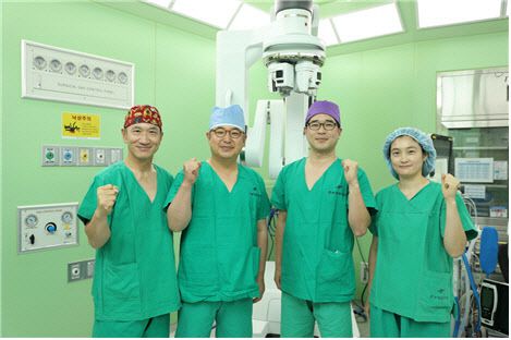 왼쪽부터 산부인과 박성호 교수(H-CORE센터장), 이비인후과 이동진 교수(병원장). 산부인과 박성택 교수(진료부원장·산부인과 과장), 산부인과 정수영 교수가 다빈치SP 앞에서 기념촬영하고 있다. |