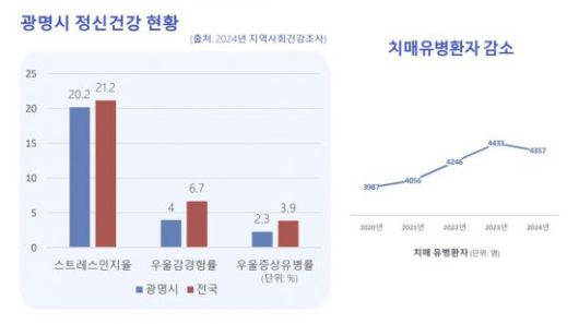 이를 통해 시는 전국 평균보다 높은 시민 정신건강 지표를 유지하고 있다. 질병관리청의 '2024년 지역사회건강조사'에 따르면 광명시 스트레스인지율은 20.2%로 전국 평균 21.2%보다 낮았다. 우울감 경험률과 우울증상 유병률 역시 각각 4%, 2.3%로 전국 평균을 크게 밑돈다.