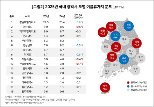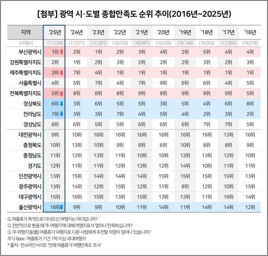 한편 ‘연례 여름휴가 여행 만족도 조사’는 ‘올해 1박 이상 국내 여름휴가(6월~8월)를 다녀왔다’고 응답한 1만7229명에게 주 여행지가 어디였는지, 그 지역에 ‘얼마나 만족했는지(만족도)’, ‘추천할 의향이 얼마나 있는지(추천 의향)’ 등을 묻고 종합만족도를 산출해 16개 광역시도별(세종시 제외)로 비교했다.
