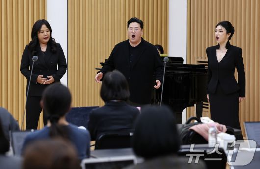 (서울=뉴스1) 구윤성 기자 = 21일 오후 서울 종로구 세종문화회관에서 열린 서울시오페라단 창단 40주년 기념 오페라 '아이다' 제작발표회에서 배우들이 '오, 사랑하는 이여 내게로 오시오' 장면을 시연하고 있다. 왼쪽부터 아이다역의 조선형, 라다메스역의 국윤종, 암네리스역의 김세린. 2025.10.21/뉴스1