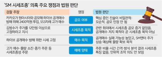 이 전 부문장은 카카오 측의 SM엔터 주식 매수는 시세조종이라고 인정하면서도, 자신이 직접 관련된 카카오엔터 매수는 물량 확보 목적일 뿐 시세조종과 무관하다고 했다. 재판부는 “카카오와 카카오엔터가 같은 비율로 SM엔터 주식을 매수했는데 이를 다르게 진술한 것은 모순”이라며 “이 전 부문장이 자신은 수사에서 벗어나면서도 카카오에 대해서는 검찰 의도에 맞는 진술을 한 것”이라고 판단했다.