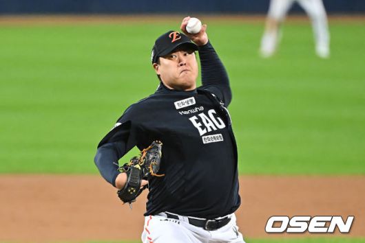 [OSEN=대구, 이석우 기자] 21일 대구 삼성라이온즈파크에서 2025 신한 SOL뱅크 KBO 플레이오프 삼성 라이온즈와 한화 이글스의 3차전 경기가 열렸다. 홈팀 삼성은 후라도가, 방문팀 한화는 류현진이 선발 투수로 출전했다. 한화 이글스 선발투수 류현진이 역투하고 있다. 2025.10.21 / foto0307@osen.co.kr