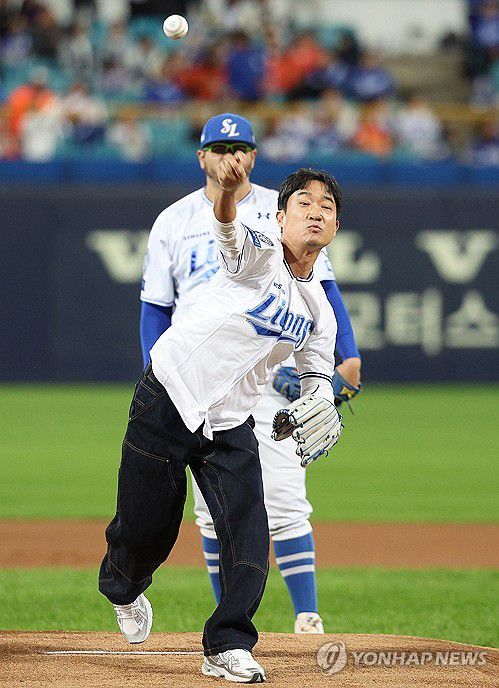 (대구=연합뉴스) 윤관식 기자 = 21일 대구 삼성라이온즈파크에서 열린 2025 프로야구 KBO리그 포스트시즌 플레이오프 3차전 한화 이글스와 삼성 라이온즈의 경기. 배우 조우진이 시구하고 있다. 2025.10.21