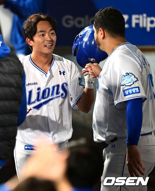 [OSEN=대구, 조은정 기자]21일 대구 삼성라이온즈파크에서 2025 신한 SOL Bank KBO리그 포스트시즌 플레이오프 3차전 삼성 라이온즈와 한화 이글스의 경기가 열렸다. 홈팀 삼성은 후라도, 방문팀 한화는 류현진을 선발로 내세웠다. 4회말 2사 삼성 김태훈이 1점 홈런을 날린뒤 후라도의 축하를 받고 있다. 2025.10.21 /cej@osen.co.kr