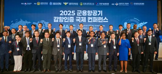 석종건 방위사업청장(앞줄 왼쪽 여덟번째)이 21일 서울 송파구 소피텔 앰배서더 서울 호텔에서 열린 군용항공기 감항인증 국제콘퍼런스에서 참석자들과 기념촬영을 하고 있다. 올해 8회를 맞은 이번 콘퍼런스에는 국내 산학연 관계자를 비롯해 미국, 말레이시아, 브라질 등 해외 협력국 관계자, 항공업계 전문가들 400여명이 참석했다. 감항인증은 정부기관이 항공기의 비행안전성에 문제가 없는지를 검증·인증하는 것이다.