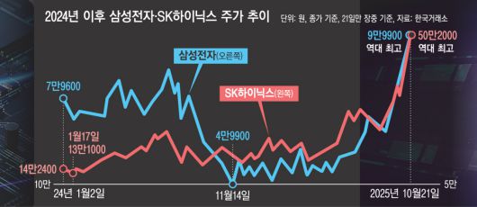 이날 유가증권시장에서 삼성전자는 전 거래일보다 600원(0.61%) 내린 9만7500원에 거래를 마쳤다. SK하이닉스는 6500원(1.34%) 떨어진 47만9000원에 거래를 마감했다. 주가 급등에 차익실현 움직임이 커지면서 종가는 하락했지만, 국내 반도체를 양분하는 삼성전자와 SK하이닉스는 장중 동반 신고가를 경신하며 새 역사를 썼다.
