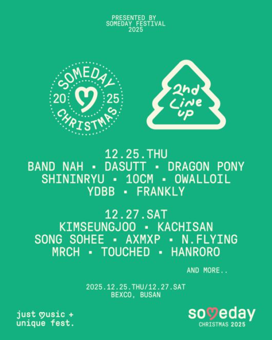 [정상래 기자] (서울=국제뉴스) 정상래 기자 = 한국을 대표하는 뮤직 페스티벌 'SOMEDAY' 10주년의 대미를 장식할 마지막 프로젝트 'Someday Christmas 2025(이하 썸데이 크리스마스)'가 12월 25일과 27일, 부산 벡스코에서 개최된다. 지난 9월 30일 1차 라인업 발표 이후 "10주년에 걸맞은 라인업, 부산 겨울이 기다려진다", "올해의 마지막도 썸데이로 마무리한다니, 이보다 완벽할 순 없다"라는 폭발적인 반응이 이어졌으며, "출발부터 완벽하니 이후 라인업도 믿고 기다린다"는 팬들의 기대 속에 2차 라인업이 공개됐다.