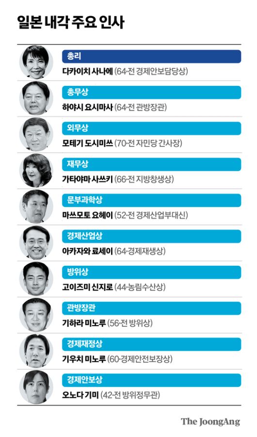 각료들은 자민당 인사들로 채워졌다. 새 파트너인 일본유신회는 내각(국무회의) 외 협력을 고수해 참여하지 않았다. 다카이치 총리는 총재 선거에서 경쟁했던 이들을 요직에 앉혔다. 결선투표에서 겨뤘던 고이즈미 신지로(小泉進次郎·44) 전 농림수산상을 방위상으로, 3위에 올랐던 하야시 요시마사(林芳正·64) 전 관방장관을 총무상으로 기용했다. 결선투표에서 다카이치 총리를 지지해준 모테기 도시미쓰(茂木敏充·70) 전 간사장은 외무상이 됐다. 총리에 이어 정권 2인자로 불리는 관방장관 자리엔 방위상 시절 야스쿠니 신사를 참배한 기하라 미노루(木原稔·56) 전 방위상을 임명해 보수색을 더했다.