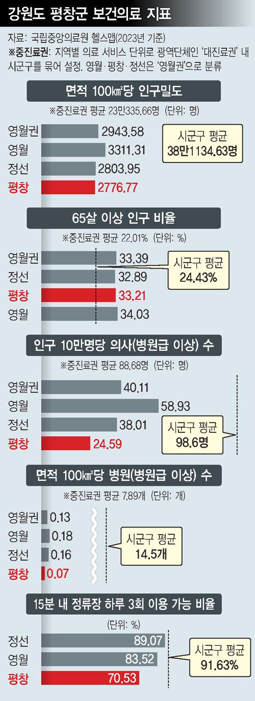 평창은 의료취약지 ‘영월권’(영월·평창·정선) 안에서도 ‘조건들’이 가장 열악했다. 영월권의 100㎢당 인구밀도 2943.58명(2023년 기준 국립중앙의료원 헬스맵)은 전국 70개 중진료권 중 밑에서 첫째였다. 영월권에서 최저(영월 3311.31명, 정선 2803.95명)는 평창(2776.77명)이었다. 전국 229개 기초자치단체 중 네번째로 땅(1464.26㎢)이 넓었으나 사람은 시군구 평균(38만1134.63명)의 137분의 1밖에 살지 않았다. 인구 10만명당 의사 수(시군구 평균 98.6명)도 영월(58.93명)·정선(38.01명)보다 적었다(24.59명). 교통 여건 역시 가장 안 좋았다. 도보 15분 거리 내 정류장에서 하루 3회 이상 버스를 이용할 수 있는 마을 비율(시군구 평균 91.63%)도 평창(70.53%)은 정선(89.07%)과 영월(83.52%)에 못 미쳤다. 사람이 적고 인프라가 취약하다는 사실은 역설적으로 다양한 일차의료 실험이 가능하단 뜻이기도 했다.