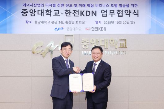 중앙대학교(총장 박상규)는 20일 서울캠퍼스 201관(본관) 총장실에서 에너지ICT 전문기업 한전 KDN(사장 박상형)과 'AI-에너지 산업분야 상호협력'을 위한 전략적 업무협약(MOU)을 체결했다고 21일 밝혔다.