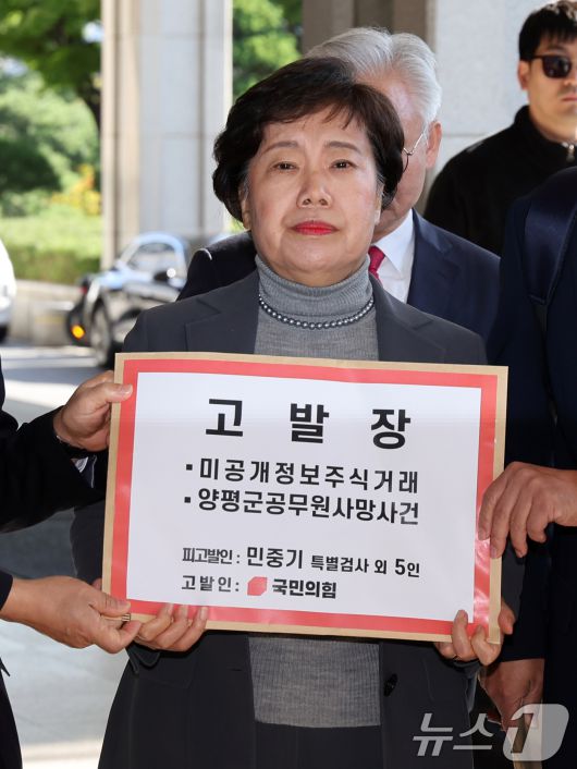 (서울=뉴스1) 황기선 기자 = 조배숙 국민의힘 사법정의수호 및 독재저지특별위원장이 22일 오전 서울 서초구 서울중앙지방검찰청 앞에서 민중기 특별검사를 자본시장법위반, 직권남용 등의 혐의로 고발하기 위해 발걸음을 옮기고 있다. 2025.10.22/뉴스1