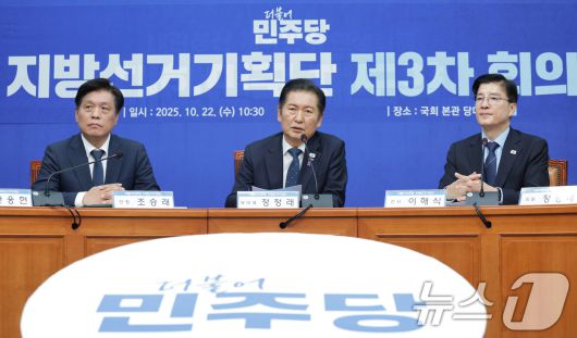 정청래 더불어민주당 대표가 22일 서울 여의도 국회에서 열린 지방선거기획단 3차 회의에서 발언하고 있다. 왼쪽은 조승래 지선기획단장, 오른쪽은 이해식 간사. 2025.10.22/뉴스1 ⓒ News1 신웅수 기자 |