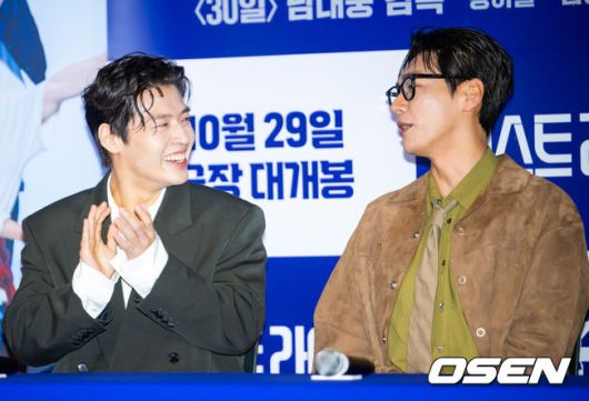 [OSEN=민경훈 기자] 22일 서울 CGV 용산아이파크몰에서 영화 '퍼스트 라이드' 언론시사회 열렸다.'퍼스트 라이드'는 끝을 보는 놈 태정(강하늘), 해맑은 놈 도진(김영광), 잘생긴 놈 연민(차은우), 눈 뜨고 자는 놈 금복(강영석), 사랑스러운 놈 옥심(한선화)까지 뭉치면 더 웃긴 24년 지기 친구들이 첫 해외여행을 떠나는 대환장 코미디 영화.배우 강하늘과 김영광이 기자간담회에서 얘기를 나누고 있다. 2025.10.22 /rumi@osen.co.kr