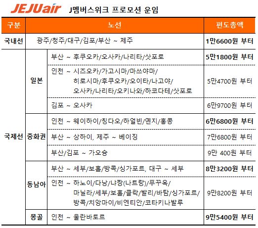 유류할증료와 공항시설사용료 등을 모두 포함한 편도 총액을 기준으로 제주항공 홈페이지와 모바일 앱, 웹을 통해 국내선은 1만6600원부터 예매할 수 있다.