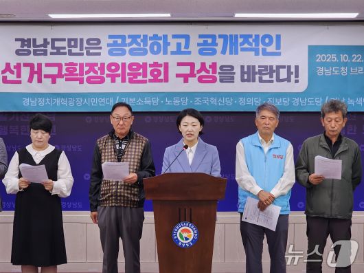 경남정치개혁광장시민연대와 진보정당이 22일 경남도청 프레스센터에서 기자회견을 열고 경남도 선거구획정위원회의 구성과 운영을 투명하게 공개할 것을 요구하고 있다. 2025.10.22 ⓒ 뉴스1 박민석 기자 |
