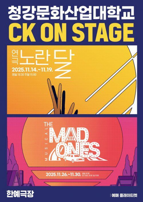 청강문화산업대학교(총장 최성신) 공연예술스쿨이 오는 11월 14일부터 30일까지 대학로에 위치한 한예극장에서 ‘CK 온스테이지(CK ON STAGE)’ 무대를 통해 뮤지컬 ‘더 매드원스’와 연극 ‘노란 달’ 2개 작품을 선보인다.