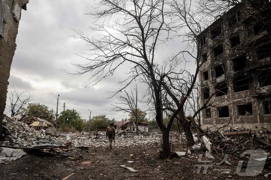 지난 12일(현지시간) 우크라이나군이 촬영해 14일에 공개한 사진에서 한 우크라이나 군인이 도네츠크 지역 코스탸티니우카의 최전선 마을에 있는 파괴된 건물 안뜰의 잔해 사이를 걷고 있다. 2025.10.12. ⓒ AFP=뉴스1 ⓒ News1 이정환 기자