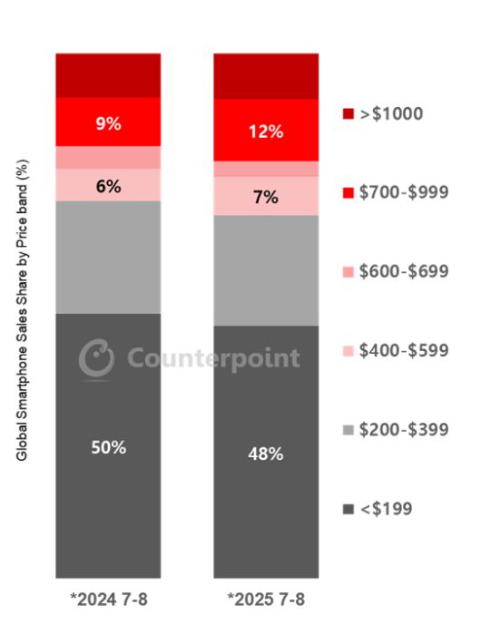 22일 시장조사기관 카운터포인트리서치에 따르면 2025년 7~8월 스마트폰 시장이 판매량 기준 전년 동기 대비 2% 성장했다. 이 기간 동안 400~599달러 및 700~999달러 가격대 스마트폰의 판매가 두 자릿수 이상 증가세를 기록했다.