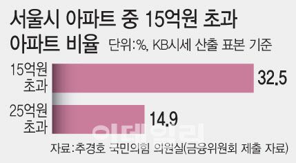 22일 금융위원회가 추경호 국민의힘 의원실에 제출한 자료에 따르면 서울 아파트 중 15억원을 초과하는 비율은 32.5%, 25억원을 넘는 아파트 비율은 14.9%로 나타났다. 이는 금융위가 KB부동산 시세(9월 말 기준)를 토대로 산출한 결과로 서울 아파트 3채 중 1채 이상이 새 대출 규제 적용 대상에 포함됐다.