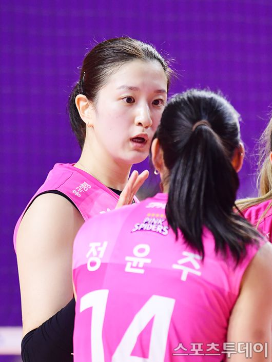 [인천=스포츠투데이 권광일 기자] 2025-2026 진에어 V-리그 여자부 흥국생명-현대건설 경기가 22일 인천 삼산원드 체육관에서 열렸다. 흥국생명 이다현이 정윤주와 이야기를 하고 있다. 2025.10.22. [스포츠투데이 권광일 기자 sports@stoo.com]