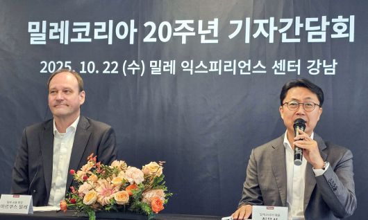 밀레(사진 왼쪽) 회장은 22일 서울 밀레 익스피리언스센터 강남에서 열린 밀레코리아 20주년 기자간담회에서 “아직 한국시장에서의 매출은 크지 않지만 한국 소비자들은 높은 안목과 품질에 대한 감각, 기술 이해력을 갖고 있어 중요한 시장”이라며 “한국 소비자의 특징은 밀레가 추구하는 가치와 완벽히 맞닿아 있다”고 이같이 말했다. 그는 한국시장에 대해 “단기적 상황이 물론 최상의 상황은 아니지만, 전체적으로 우상향”이라고 분석했다.