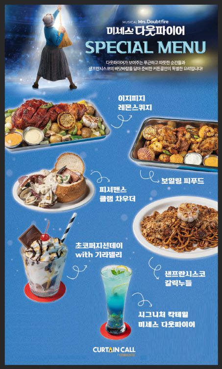 신규 메뉴 ‘다웃파이어 키친’은 극의 배경인 샌프란시스코를 모티브로 구성됐다. 극 중 다웃파이어가 ‘Easy Peasy’ 넘버를 부르며 요리하는 장면에서 영감을 받은 칠면조 요리 ‘이지피지 레몬스퀴지’를 비롯해 △샌프란시스코 항구와 바다를 연상시키는 ‘보일링 씨푸드’, △전설적인 클래식 디시 ‘샌프란시스코 갈릭 누들’, △가을 시즌에 어울리는 ‘피셔맨스 클램차우더’, △기라델리 초콜릿을 활용한 디저트 ‘초코퍼지선데이 with 기라델리’, △샌프란시스코 바다를 닮은 시그니처 칵테일 ‘미세스 다웃파이어’까지 다채로운 스페셜 메뉴가 마련됐다.