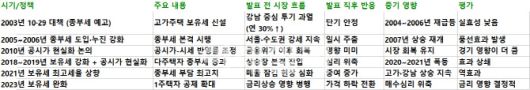 부동산 정책 실패는 문재인 정부 때도 반복됐다. 수도권을 중심으로 부동산 가격이 폭등하자 문재인 정부는 2018년 이후 종부세율 인상·공시가격 현실화·다주택자 중과 등 역대급 보유세 강화 기조를 이어갔다.