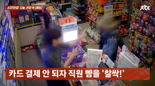 21일 새벽 부산의 한 편의점을 찾은 한 중년 남성이 난동을 부리고 있다./사진=JTBC '사건반장' 캡처 |