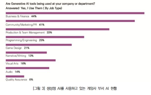 해외에서는 게임의 제작 단계 및 관리 경영 측면에서 AI를 활용 중이라는 설문조사 결과가 나왔다. 게임 전문 매체인 게임 디벨로퍼가 2024년 1월 3천 명의 게임 업계 종사자를 조사한 설문조사 결과 생성형 AI 사용 여부에 대해 49%가 사용 중이라고 응답했으며, 사용하지 않은 사람들 중 15%도 사용에 관심이 있다고 답했다. 대부분 경영 및 금융(44%)과 마케팅 및 PR(41%) 분야에서 적극 생성형 AI를 사용한다고 밝혔으며, QA와 글쓰기 및 오디오 같은 분야에도 사용하는 것으로 조사됐다. 또 반복 작업을 자동화하기 위한 활용도 이루어지고 있었다.