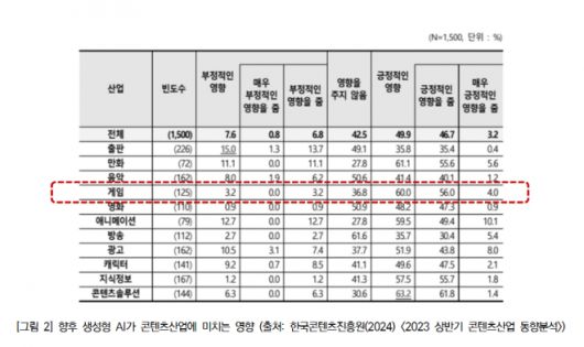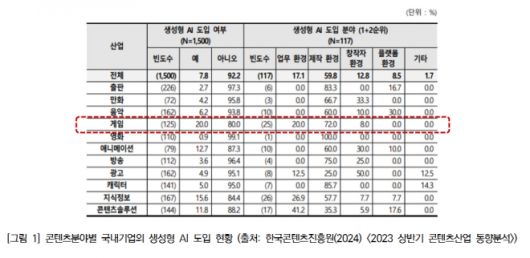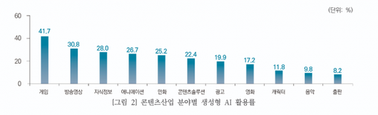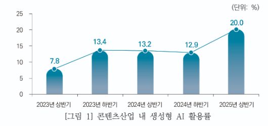 또 한국콘텐츠진흥원에서 연구 및 발표한 'CONTENT with AI: 2025년 콘텐츠산업 생성형 AI 활용 동향과 일자리 변화' 리포트에 따르면, 2025년 상반기 국내 콘텐츠산업 생성형 AI 활용률은 20%(조사 응답 사업체 2513개, 생성형 AI 활용 사업체 503개사)로 2024년 하반기 대비 7.1%p 증가했다. 이는 한국콘텐츠진흥원 조사 이래 가장 높은 활용률이다.