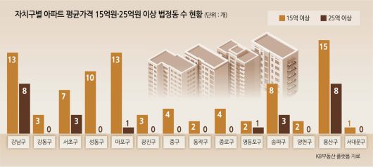 평균 가격이 25억원 이상인 법정동을 가장 많이 가진 자치구는 강남구(8개)와 용산구(8개)였으며, 그다음 서초구(3개)·송파구(3개), 그리고 마포구(1개)와 영등포구(1개) 순으로 집계됐다.