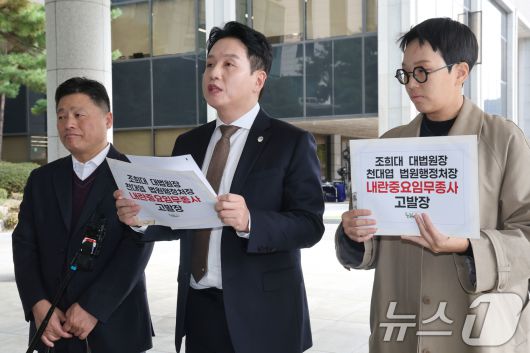 (서울=뉴스1) 이광호 기자 = 임태훈 군인권센터 소장(가운데)이 23일 오후 서울 서초구 서울고등검찰청 앞에서 내란 특검 고발인 조사 출석 및 조희대 대법원장과 천대엽 법원행정처장 고발 기자회견을 하고 있다. 2025.10.23/뉴스1skitsch@news1.krCopyright ⓒ 뉴스1. All rights reserved. 무단 전재 및 재배포, AI학습 이용 금지.